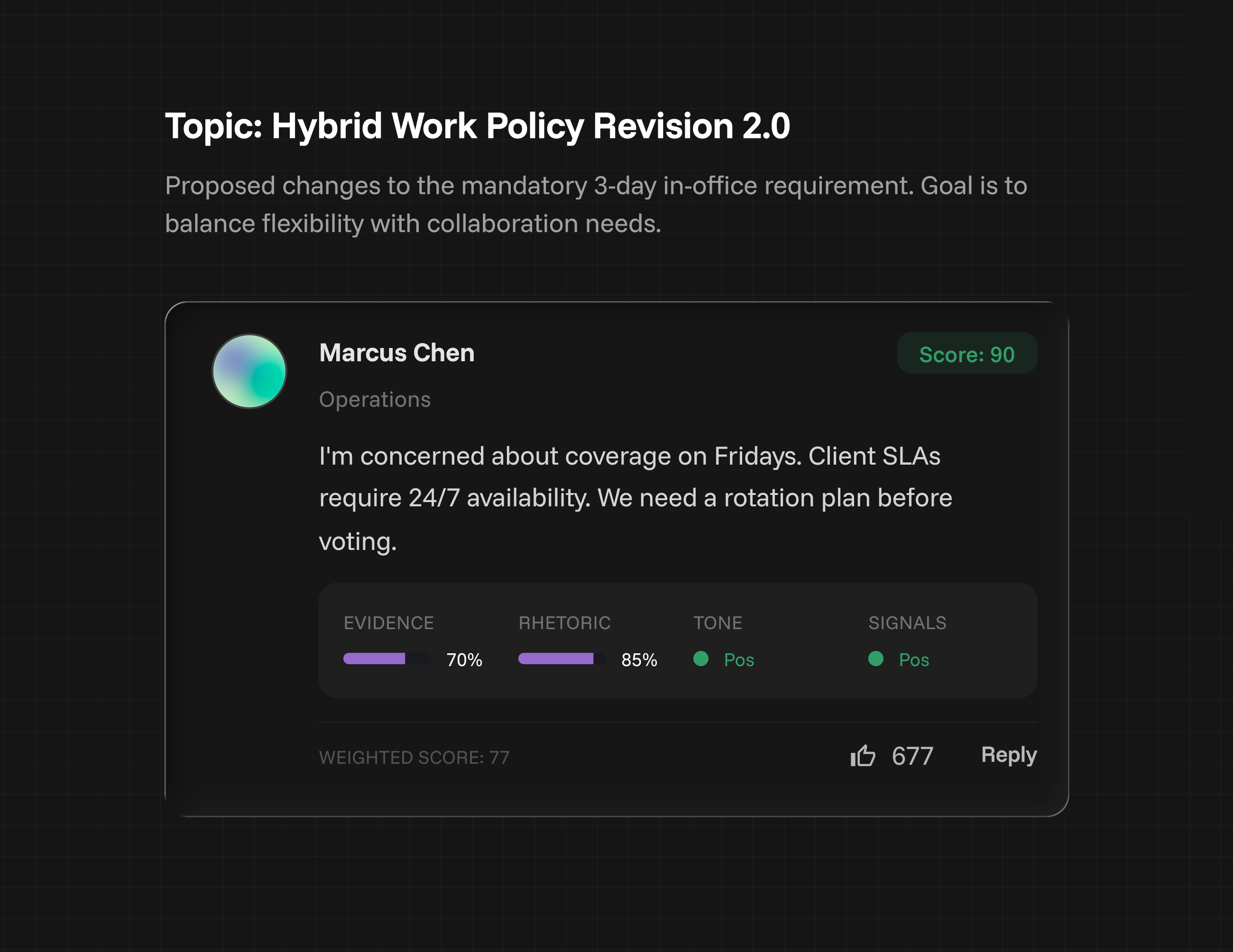 Bringing rhetoric, context, evidence, objectives, emojis, attachments, and votes into a single view, with scores reflecting the full body of the exchange, including tone, delivery, and nonverbal signals like facial expression and body language when available.