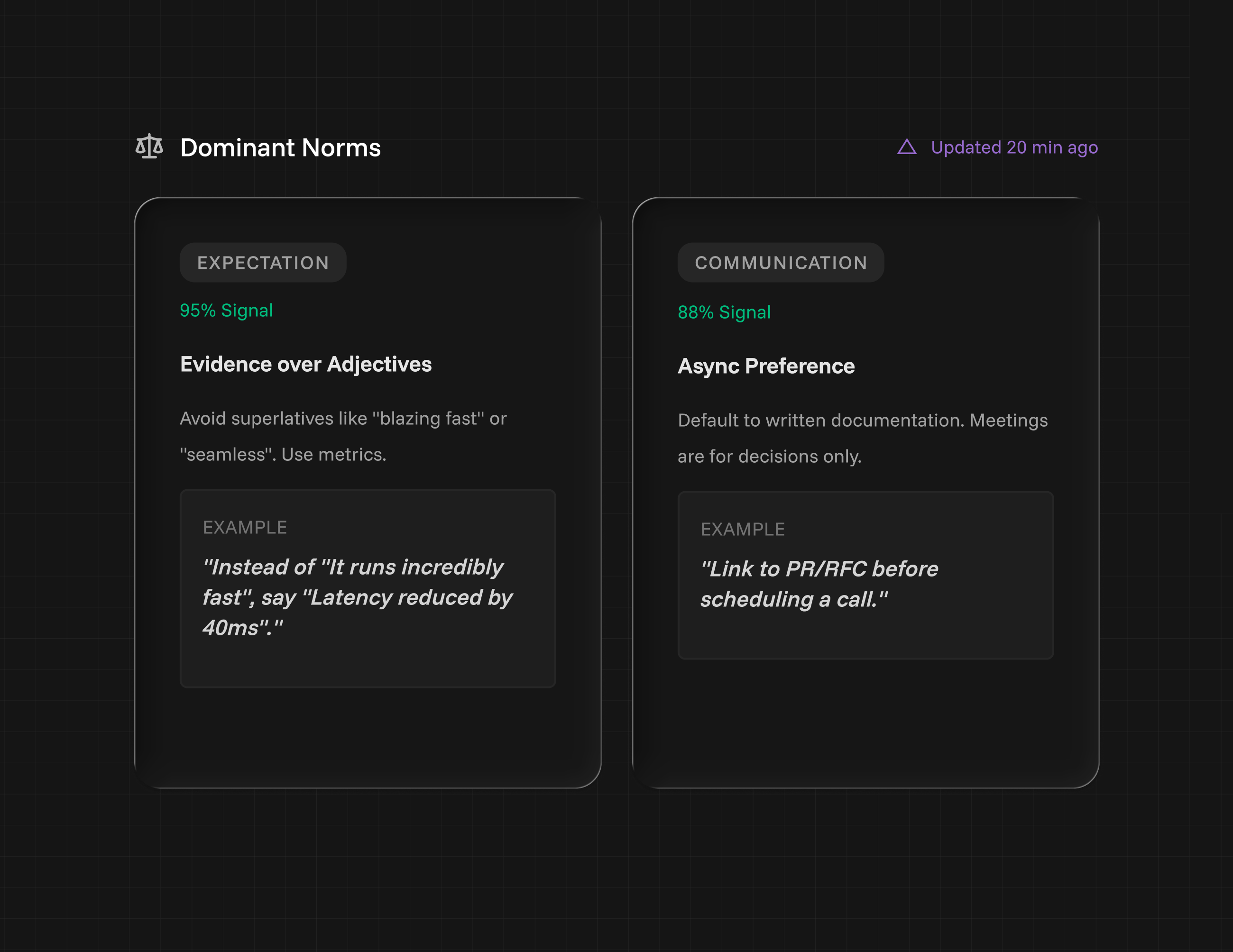 thinkwell™ captures recurring norms from real language, then stores them as guidance your team can use before drafting, replying, or analyzing anything.