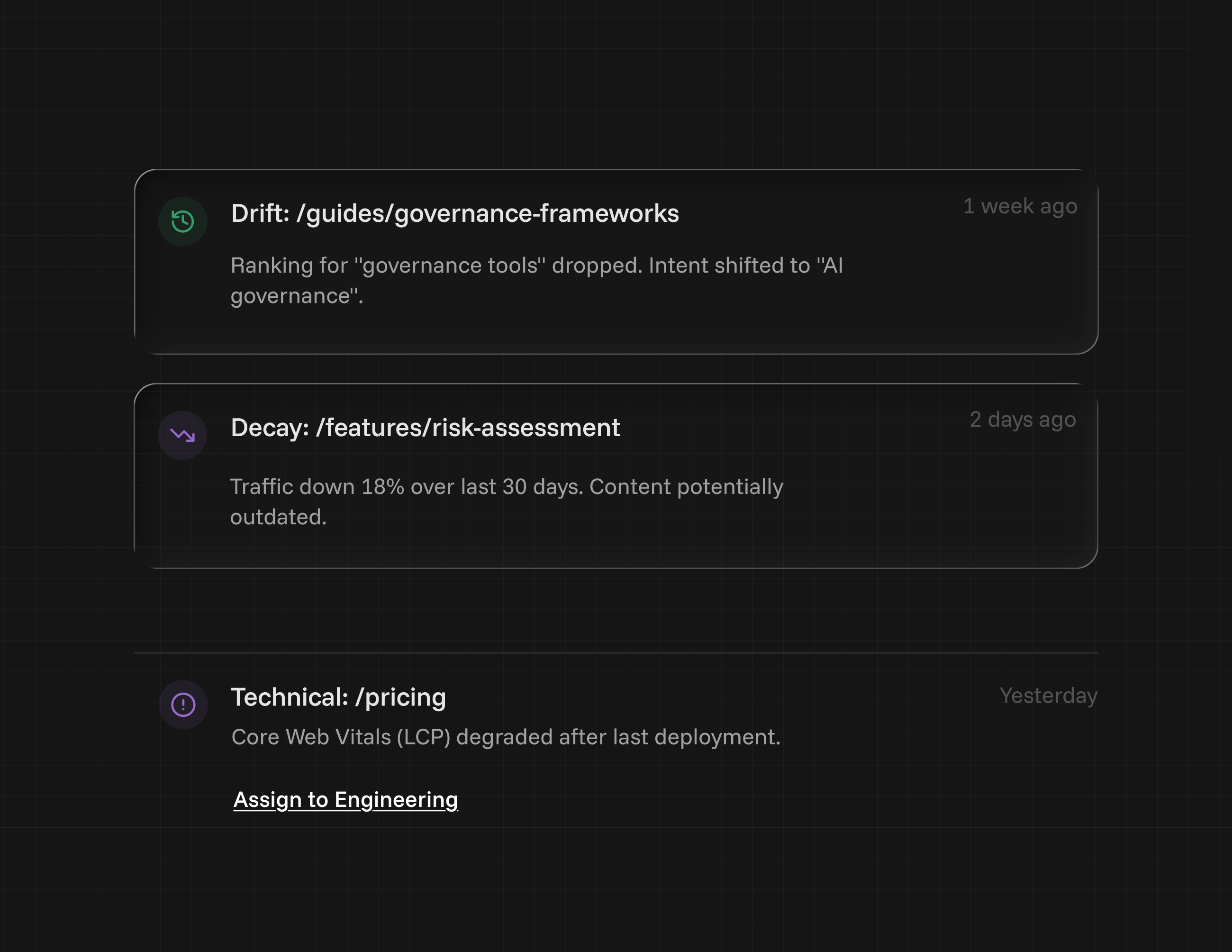 We help you keep content current, compare updates fairly, and coordinate fixes fast when rankings or traffic move.